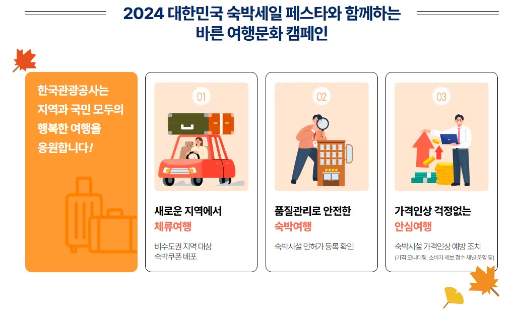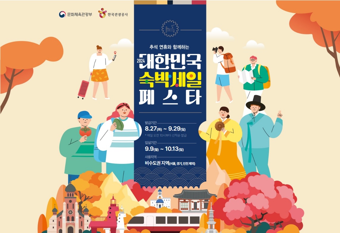 2024년 추석 연휴를 맞이하여 한국관광공사와 문화체육관광부에서 2024 대한민국 숙박세일 페스타와 함께하는 바른 여행문화 캠페인을 하고 있습니다. 이번 2024 대한민국 숙박세일 페스타는 2024. 8. 27. 화요일부터 2024. 9. 29. 일요일까지 이어지는데요. 이 글에서는 2024년 추석 연휴와 함께하는 대한민국 숙박세일 페스타 숙박할인권 발급기간, 입실기간, 사용지역, 사용처, 사용방법, 할인혜택, 숙박 할인권 사용방법, 숙박 상품 취소 수수료 안내, 숙박 할인권 사용 유의사항, 공통 유의사항, 전담 콜센터에 대해 알아보도록 하겠습니다.
